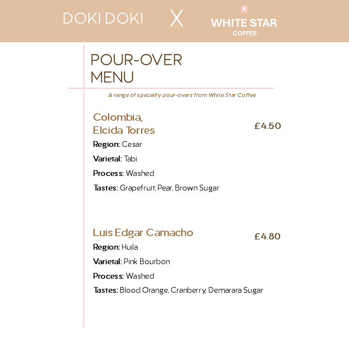 - Pour-Over Coffee Menu: Specialty pour-over coffee options are available, featuring beans like Colombia Elcida Torres and Luis Edgar Camacho, which cater to coffee enthusiasts seeking a refined brewing method.