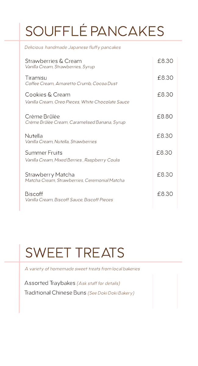 - Soufflé Pancakes: A selection of pancakes with different toppings such as Strawberries & Cream, Tiramisu, Cookies & Cream, Crème Brûlée, Nutella, Summer Fruits, Strawberry Matcha, and Biscoff. These are presented as a sweet, light meal or snack option.